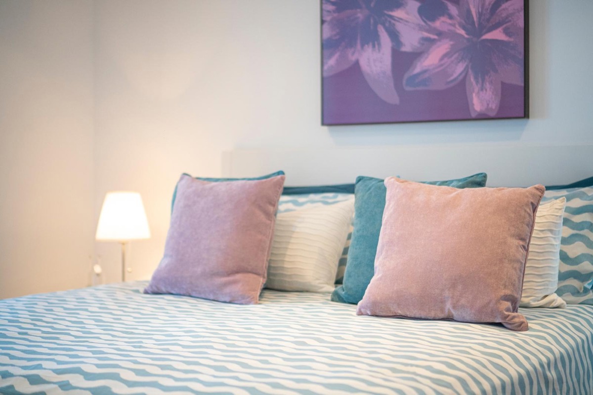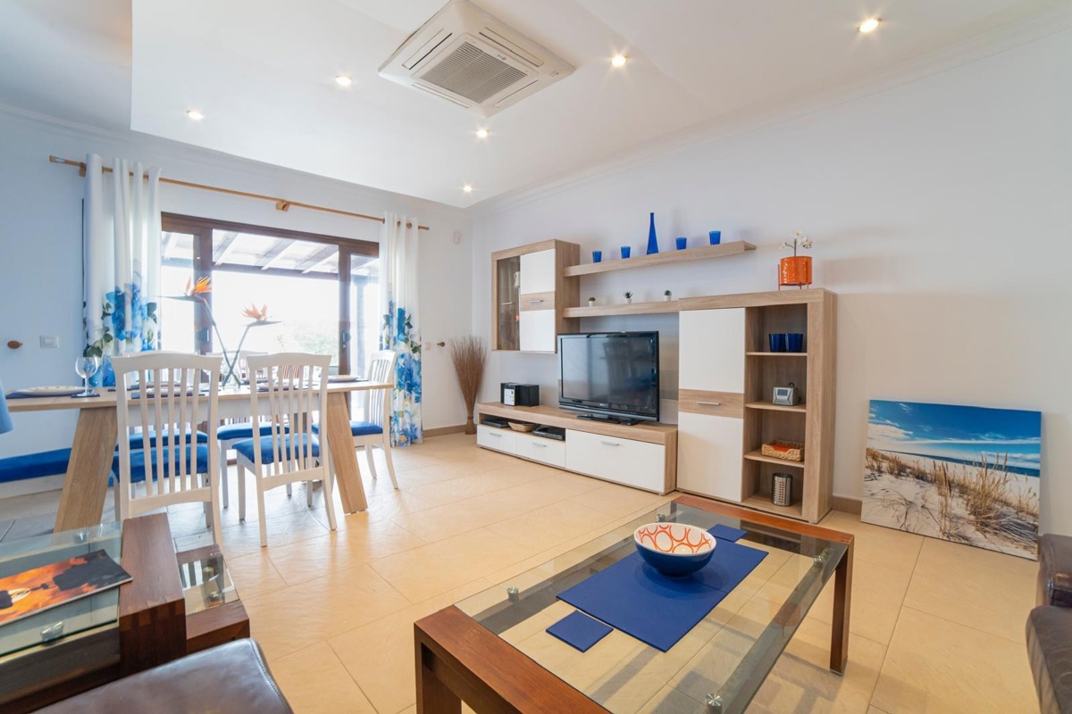 The villa features three stylish bedrooms, two contemporary bathrooms, and a bright open‑plan living space with a fully equipped kitchen.